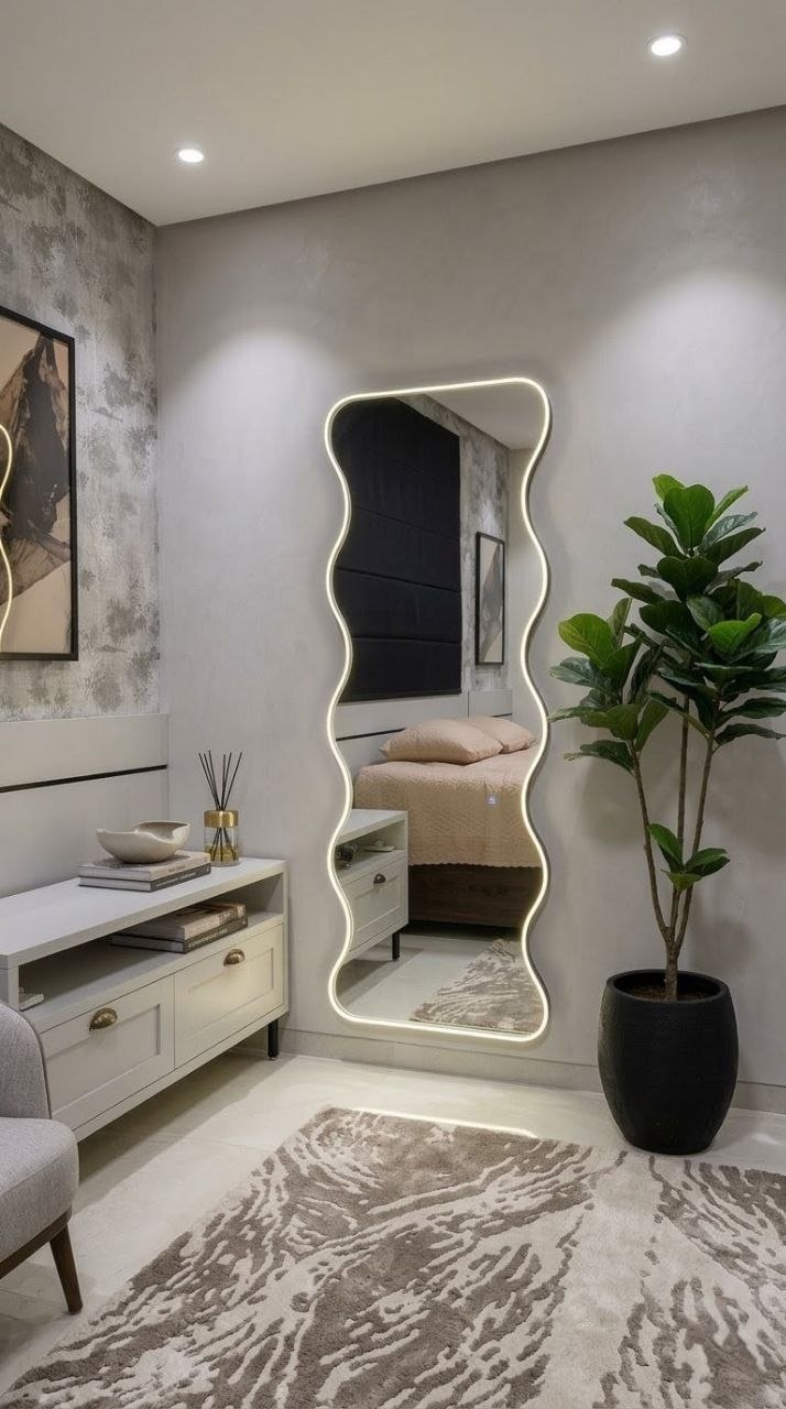 ✨ Design Sofisticado – As curvas do espelho são realçadas pela iluminação, criando um efeito elegante e moderno para qualquer ambiente.